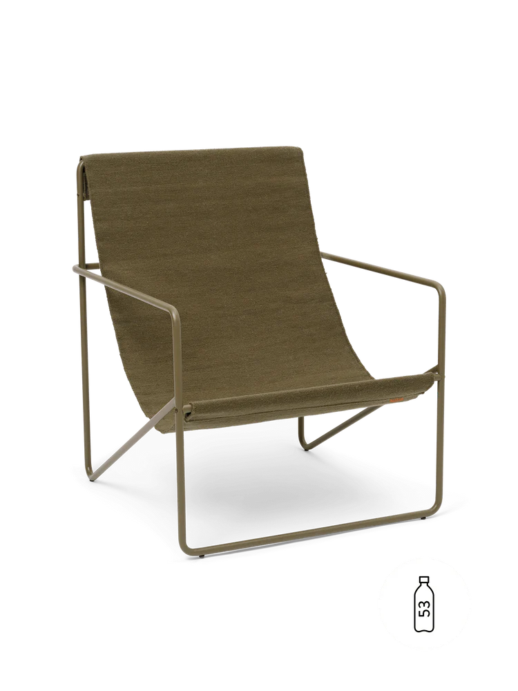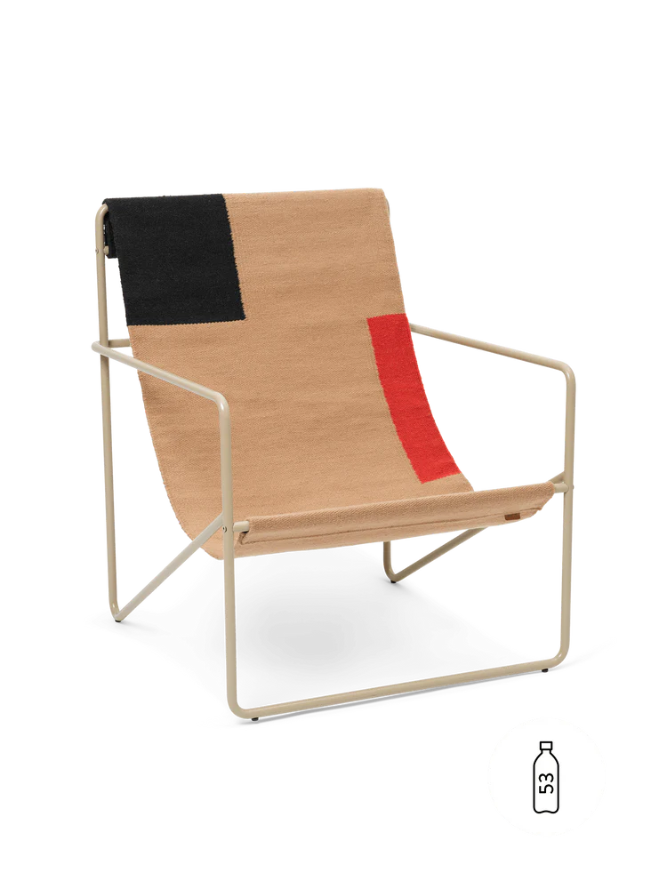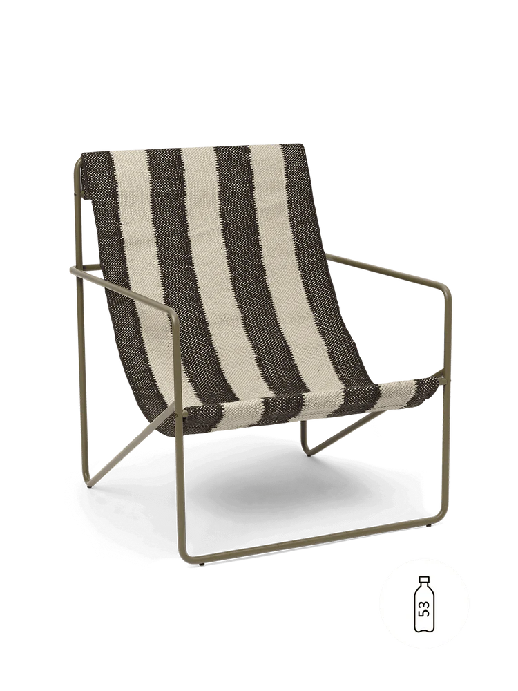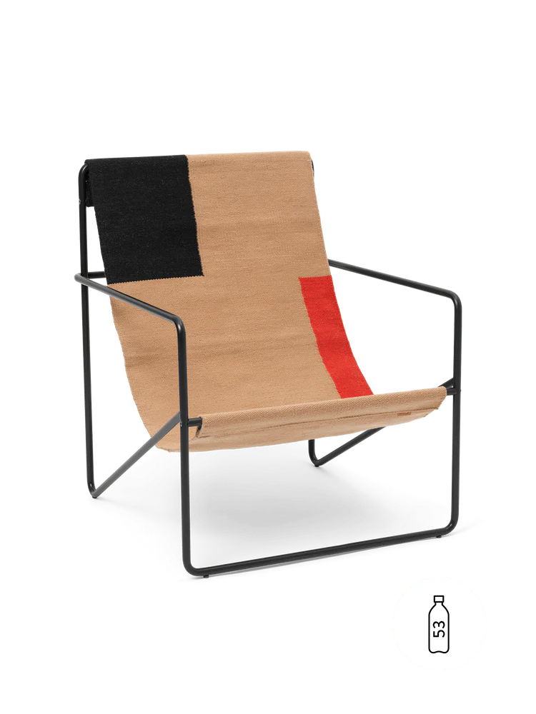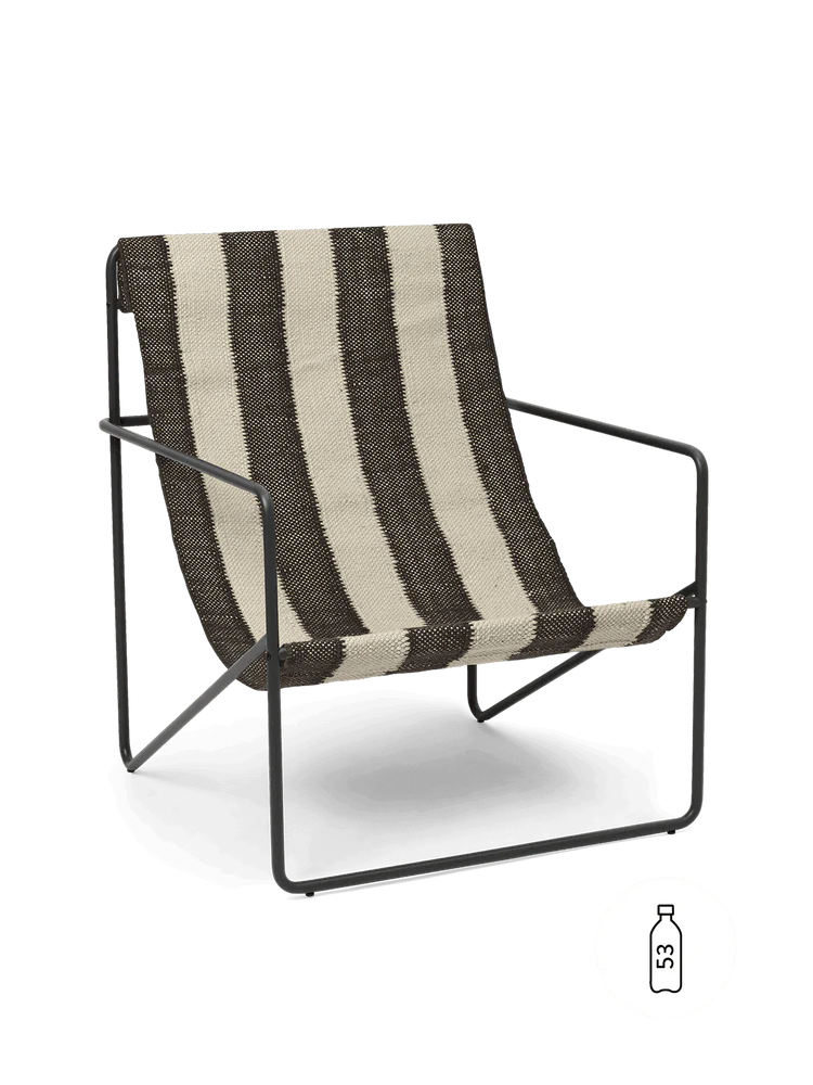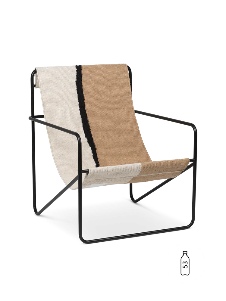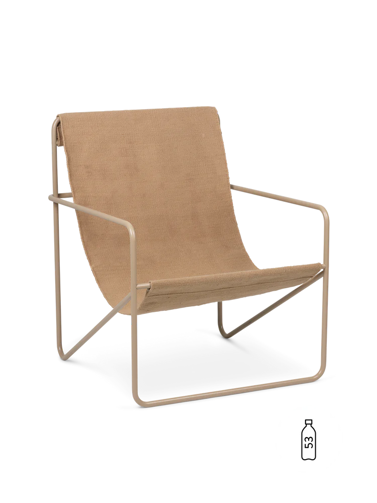 A modernist chair with a graceful profile, the Desert Lounge Chair is crafted from a tubular powder coated steel frame, holding a handwoven textile seat made entirely from recycled post consumer plastic that has been spun into PET yarn. Each seat equates to being made up of 53 1L plastic bottles! Suitable for use both indoors and out, the lounge design invites relaxation.