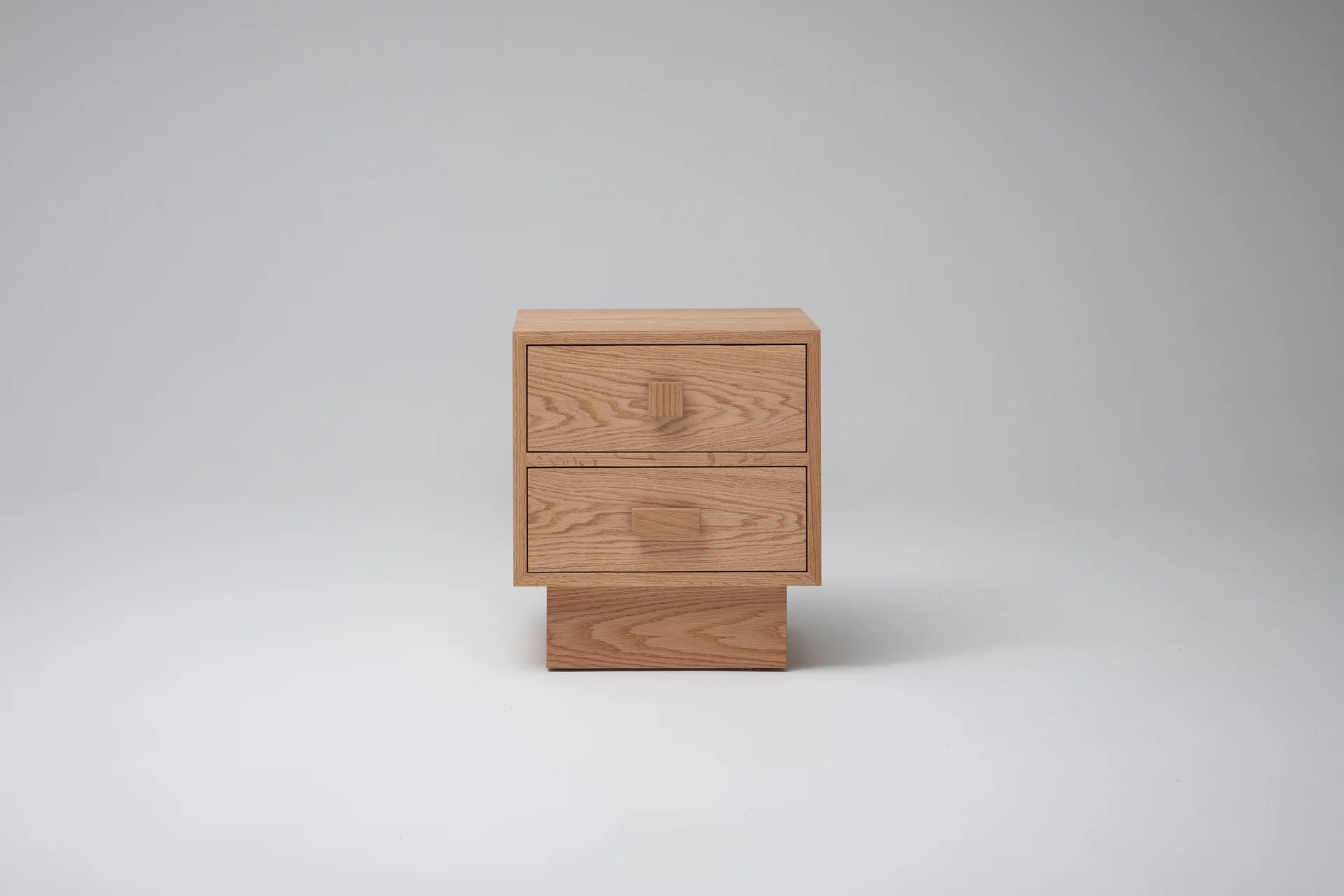 Distinct shapes and textured wood grain make the Wren Bedside Table a cosy bedroom addition. Contrasting handles and mitred edges elevate form and character, with two soft-close drawers offering functional storage and a thoughtful space to hold much loved items
