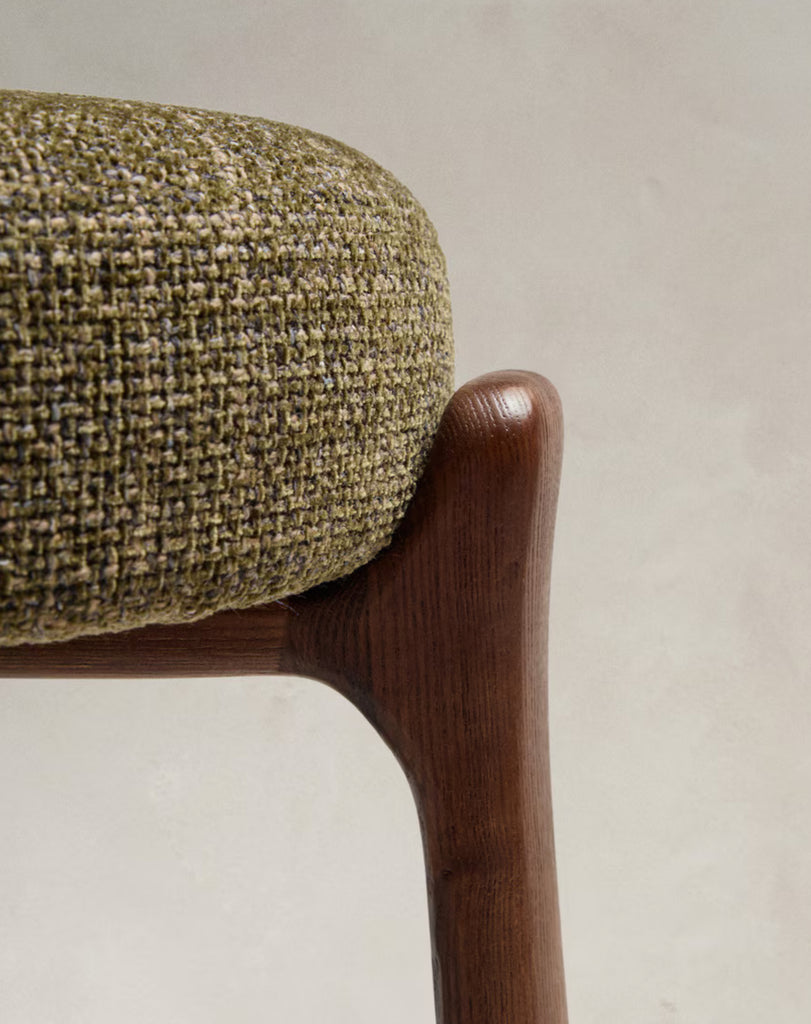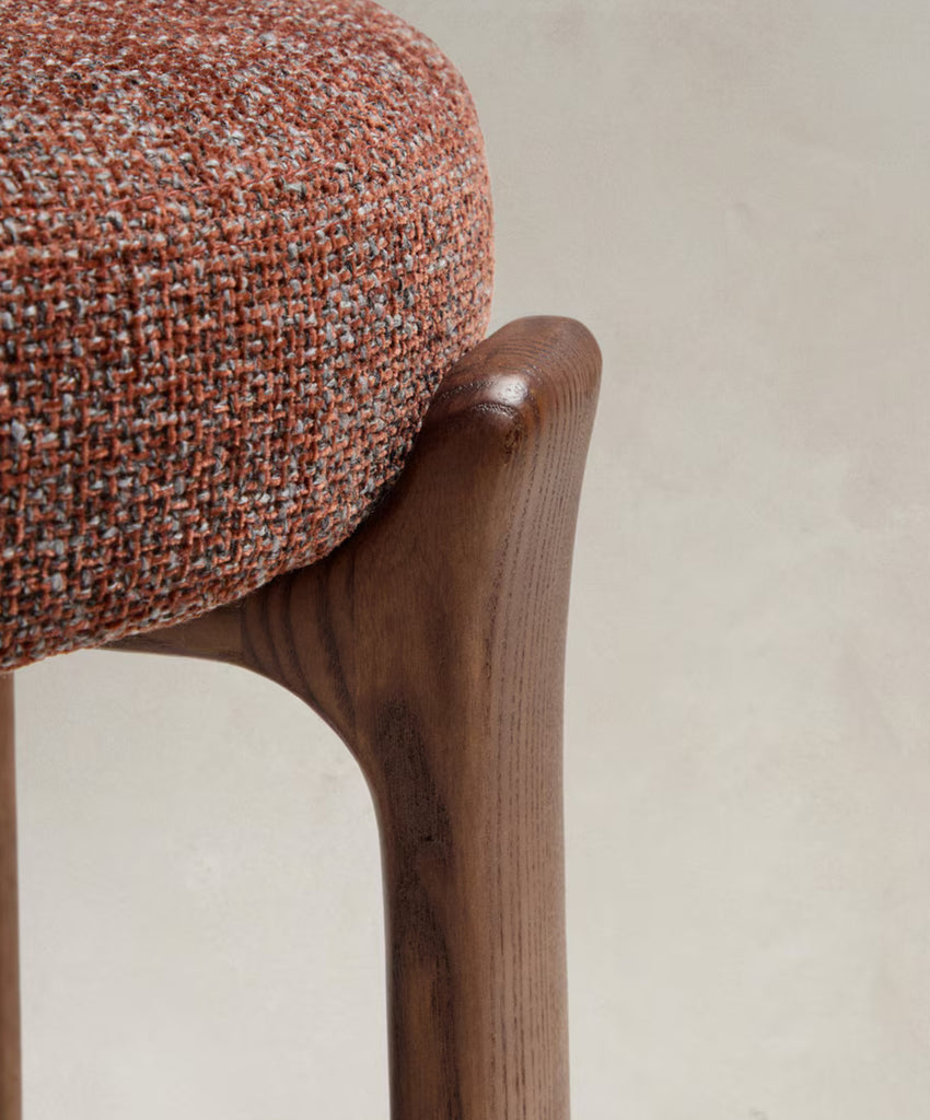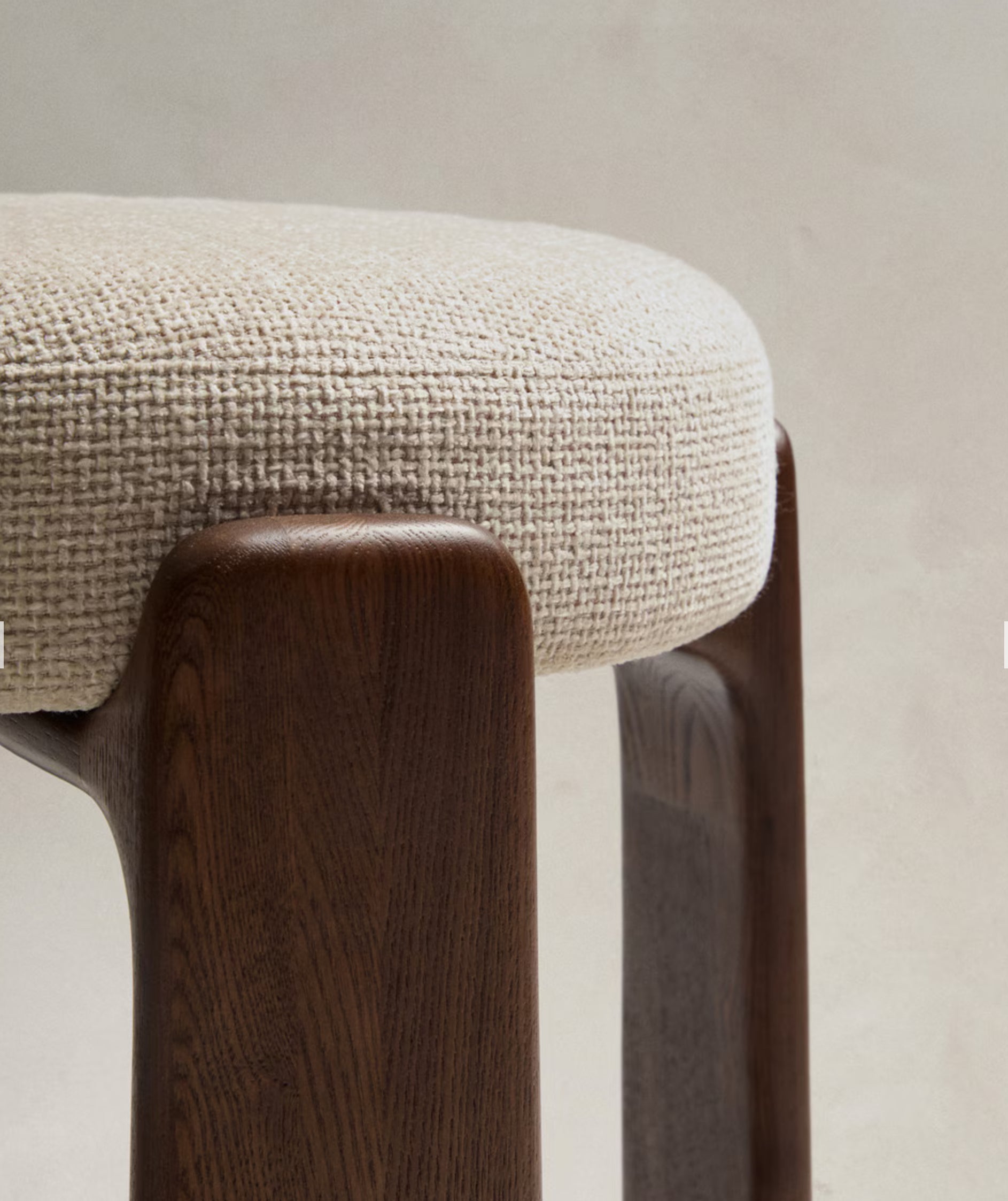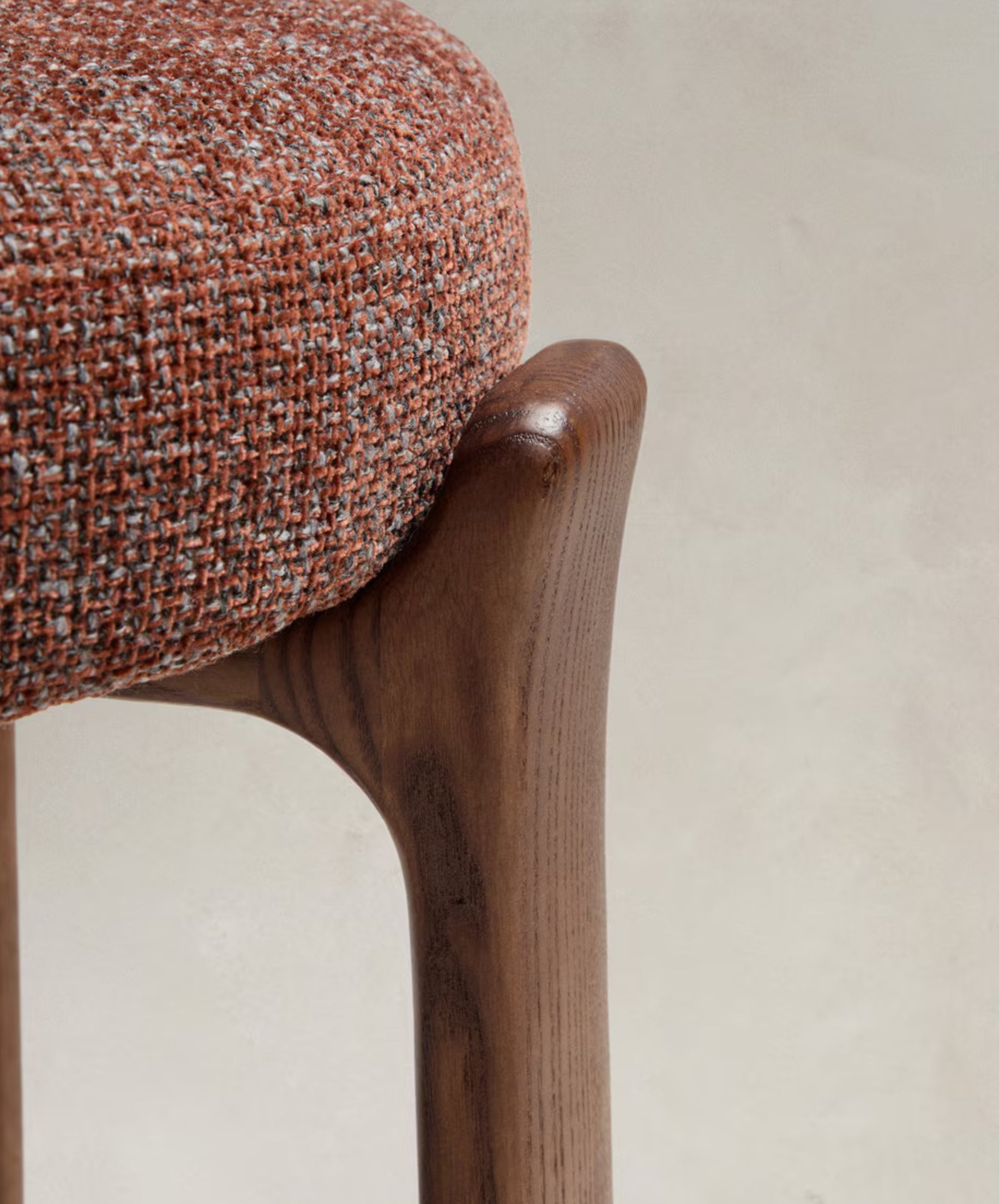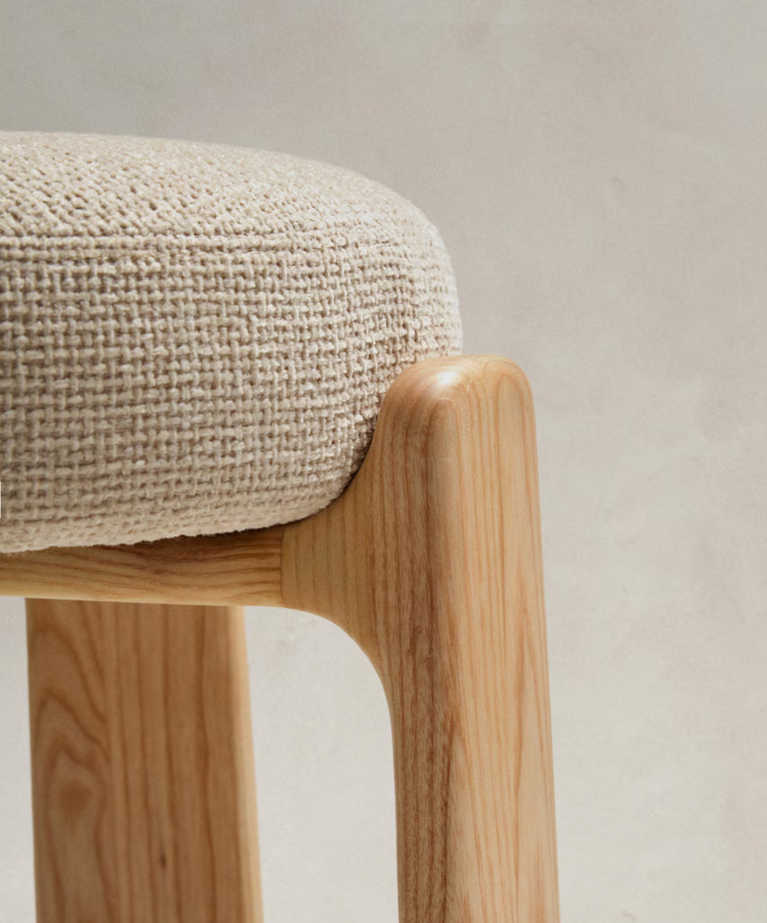 The Grace backless stool is upholstered in a thick, two tone chenille and solid ash wood legs. Fabric made from recycled material and with a GRS certificate and wood with FSC 100% chain of custody certification, sourced from a responsible forest management model.