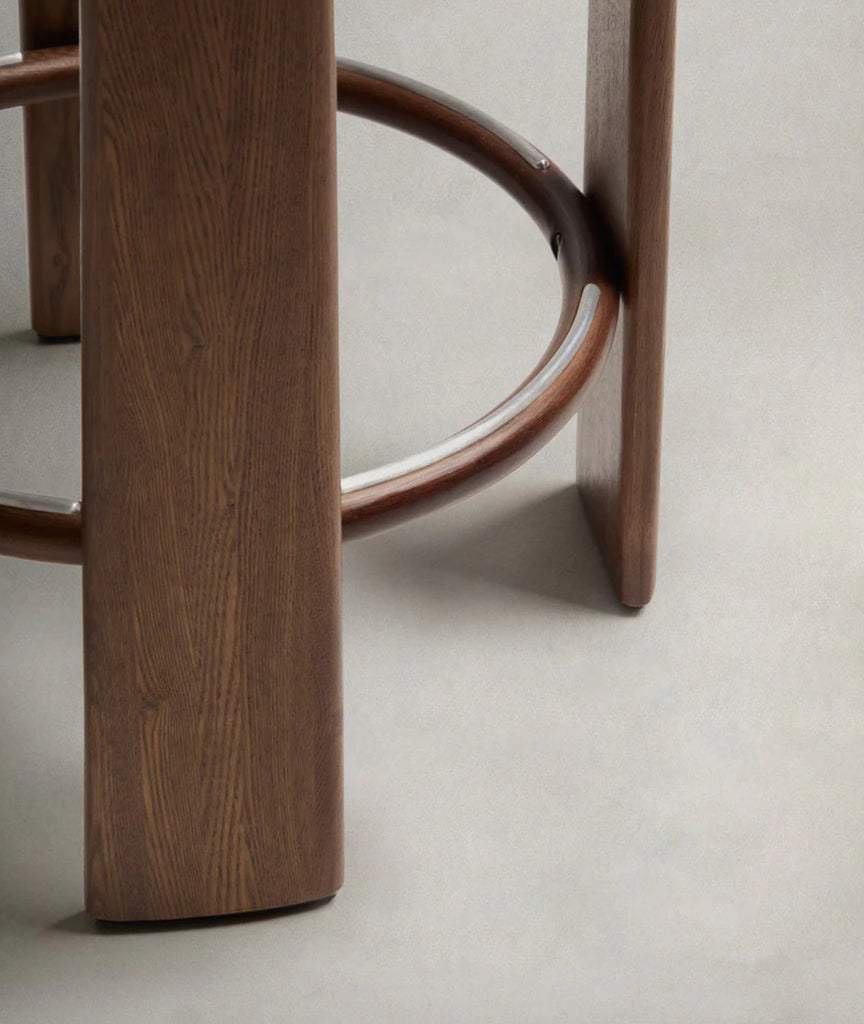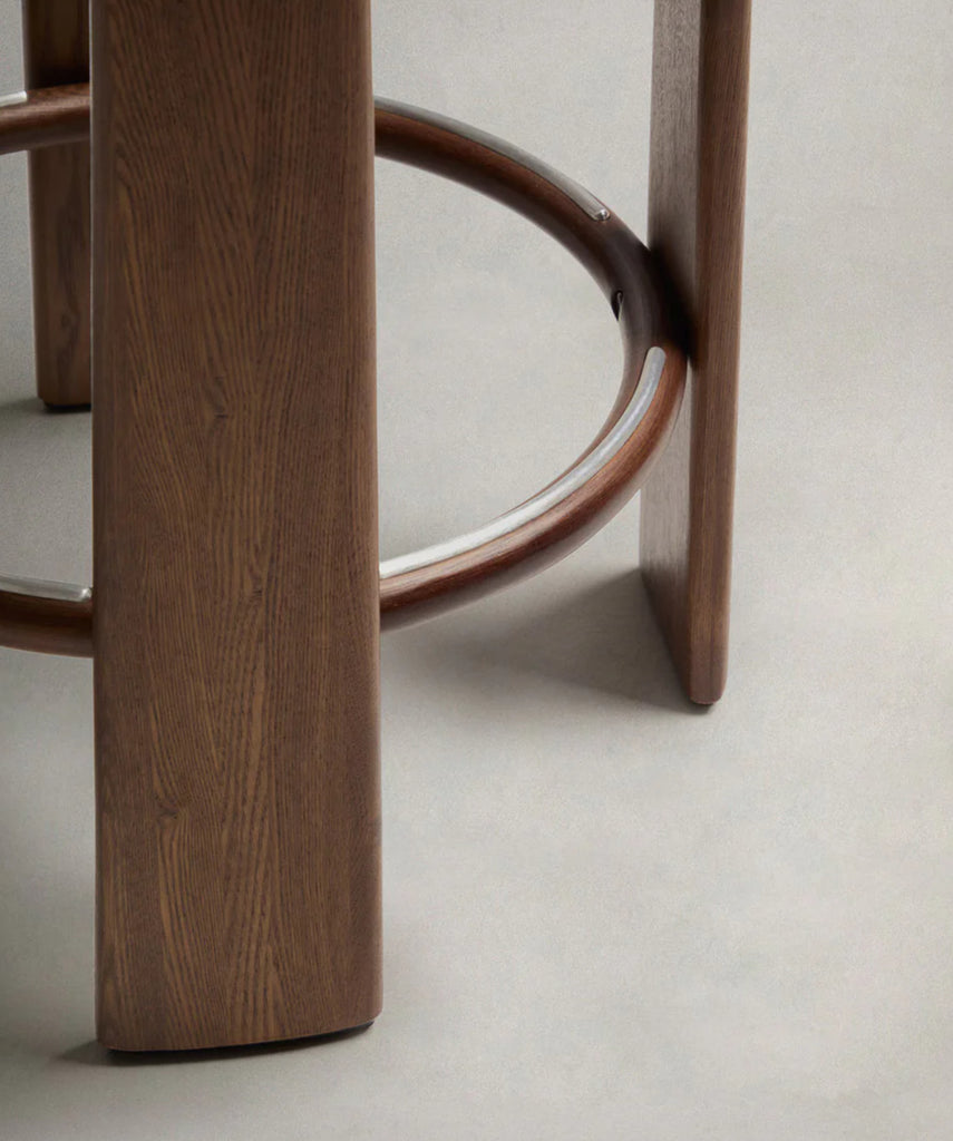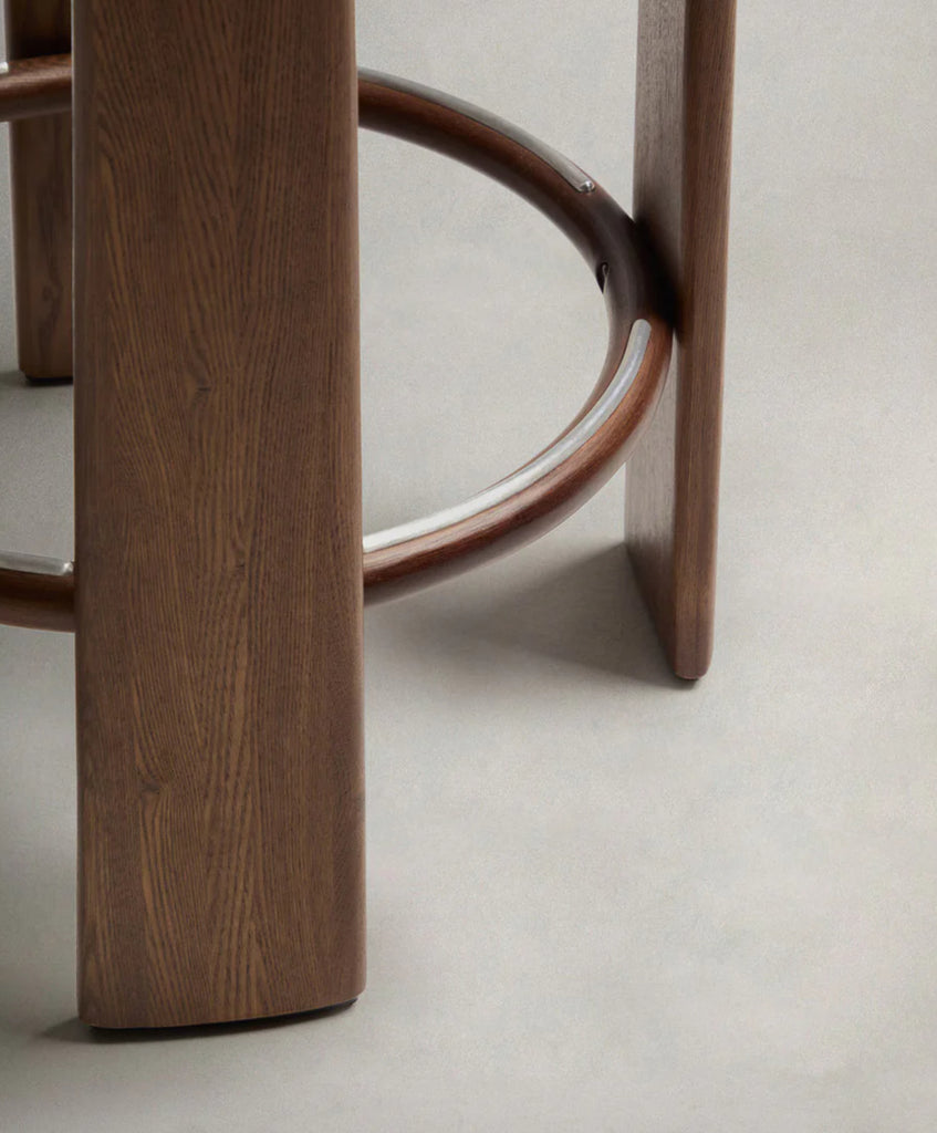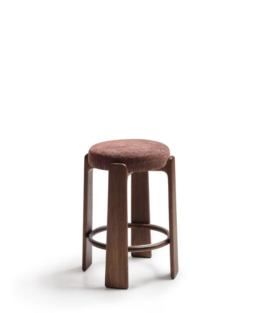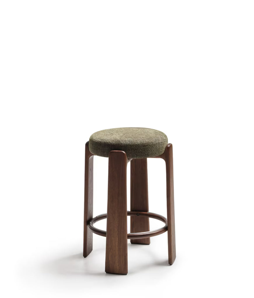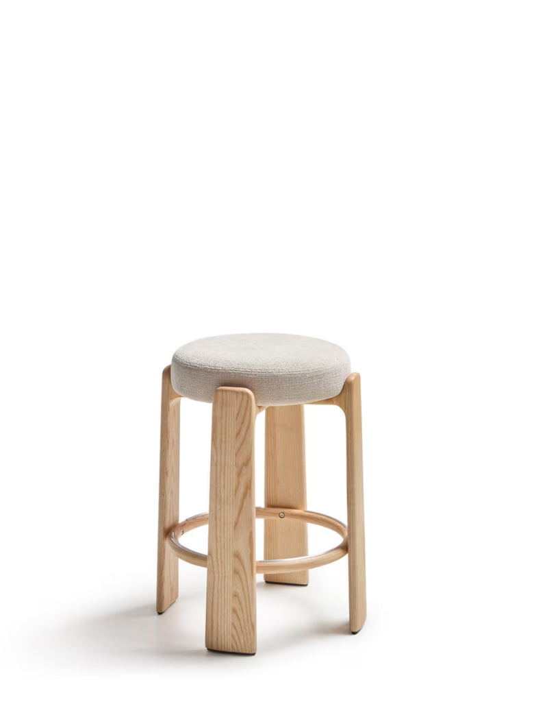 The Grace backless stool is upholstered in a thick, two tone chenille and solid ash wood legs. Fabric made from recycled material and with a GRS certificate and wood with FSC 100% chain of custody certification, sourced from a responsible forest management model.