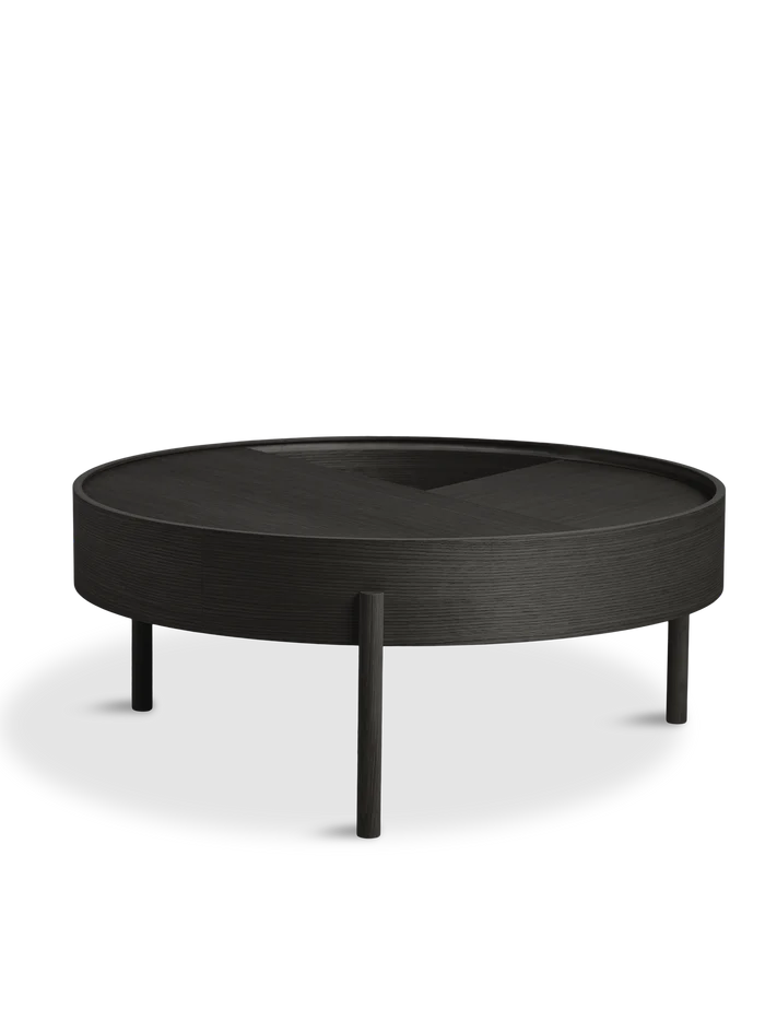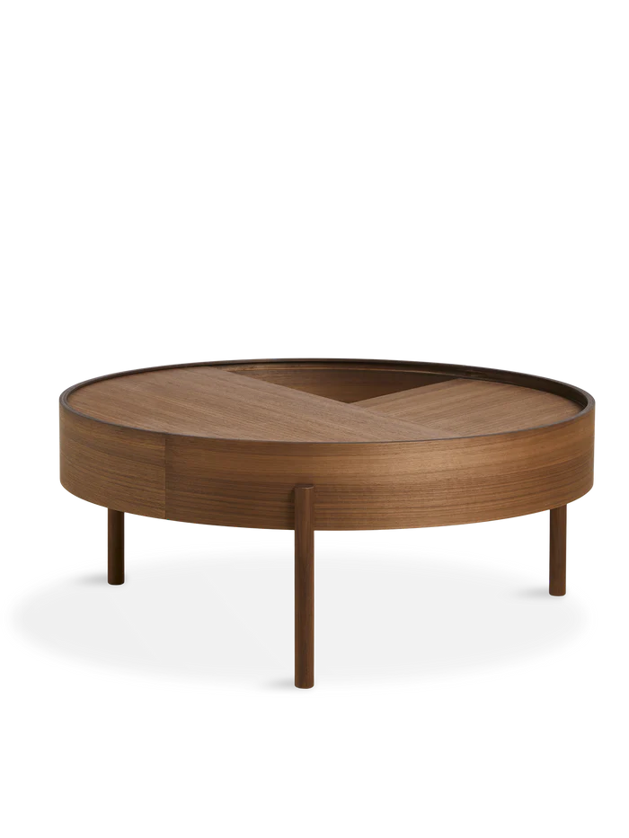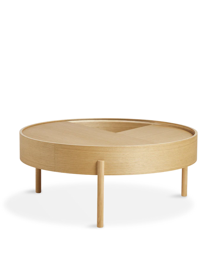ARC takes its name from the mathematical concept of a smooth curve joining two points in a circle. The ARC table invites its user to make use of the simple functionalities, use one finger to turn the upper tabletop. Let it be open with your favourite objects on display or close the lid to hide your mess. The surface on the inside storage space is covered with a smooth nano laminate to complement the wood while the three-legged construction adds a playful and light touch to the geometric shaped design.